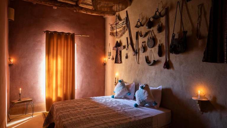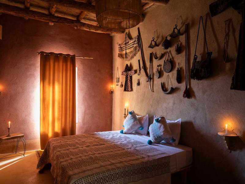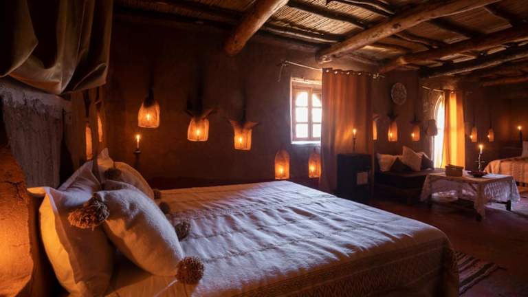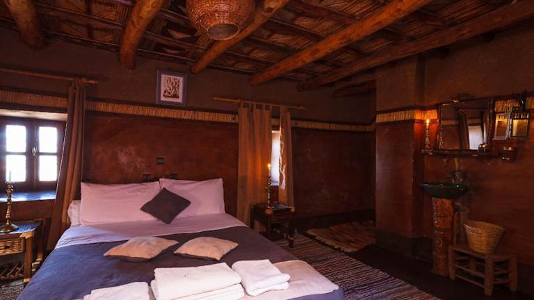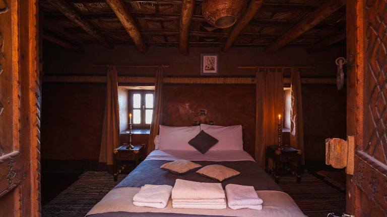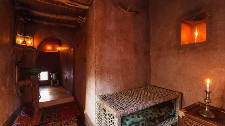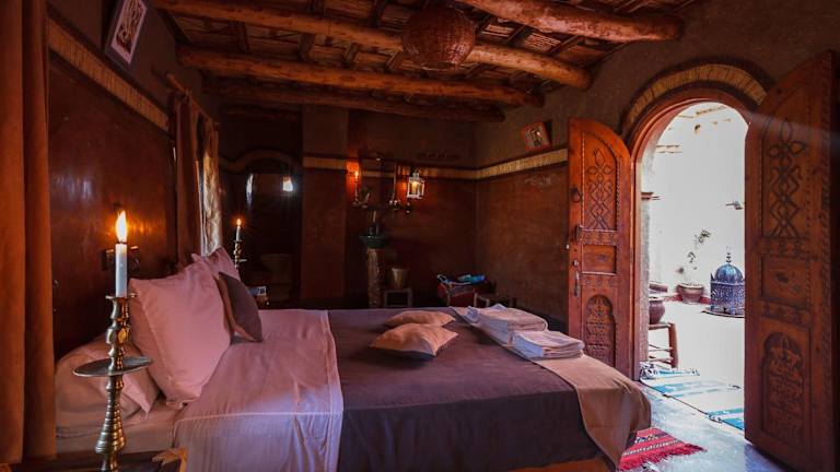 Alle Zimmer im Kasbah Tebi sind traditionell eingerichtet und verfügen über ein eigenes Bad mit Dusche und WC. Sie sind bei Kerzenschein beleuchtet und schaffen eine heimelige Atmosphäre.