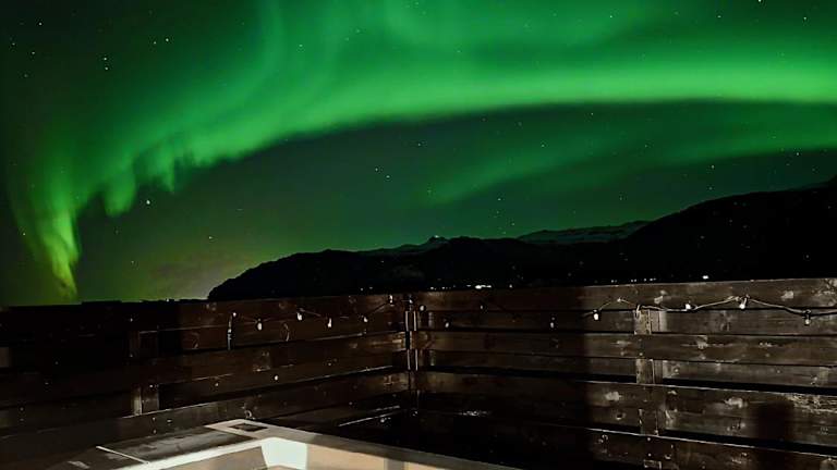 Aurora Cabin and Private Jacuzzi bietet kostenloses Wifi und eine private Parkiermöglichkeit. Die Unterkunft hat eine Terrasse mit Meerblick sowie Zugang zu einem Whirlpool und einem Garten. Die Nutzung von Wassersportarten wie Angeln und Velofahren ist in der Nähe möglich.