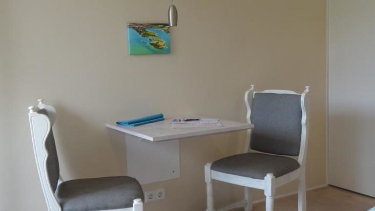 Die Ferienwohnung besteht aus einem Schlafzimmer, einem Wohnzimmer und einem Badezimmer mit Dusche und Haartrockner. Zur Ausstattung gehören eine voll ausgestattete Küche mit Kühlschrank, Kaffeemaschine und Wasserkocher. Handtücher und Bettwäsche werden bereitgestellt, und die Unterkunft ist mit Heizung ausgestattet.
