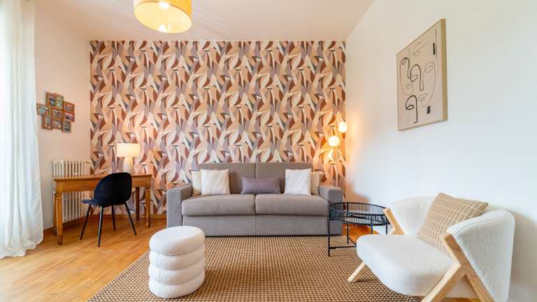 Die Ferienwohnung verfügt über ein Schlafzimmer, ein Wohnzimmer sowie eine voll ausgestattete Küche mit Kühlschrank und Kaffeemaschine. Zudem hat es ein Badezimmer mit Bidet und Dusche. Handtücher und Bettwäsche werden bereitgestellt.