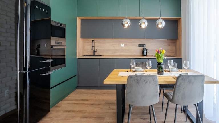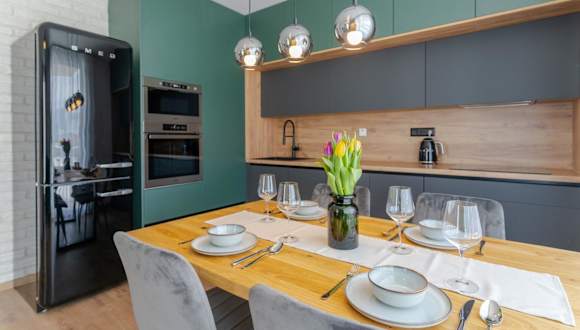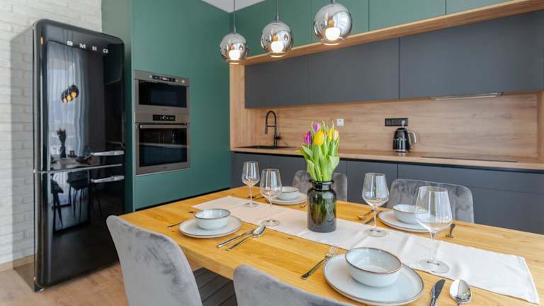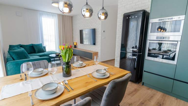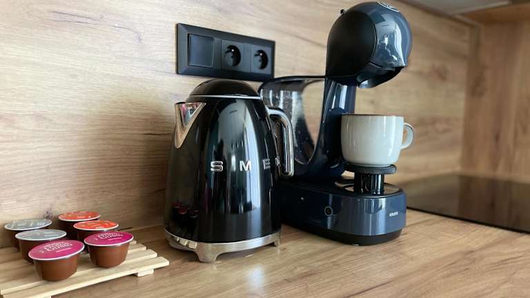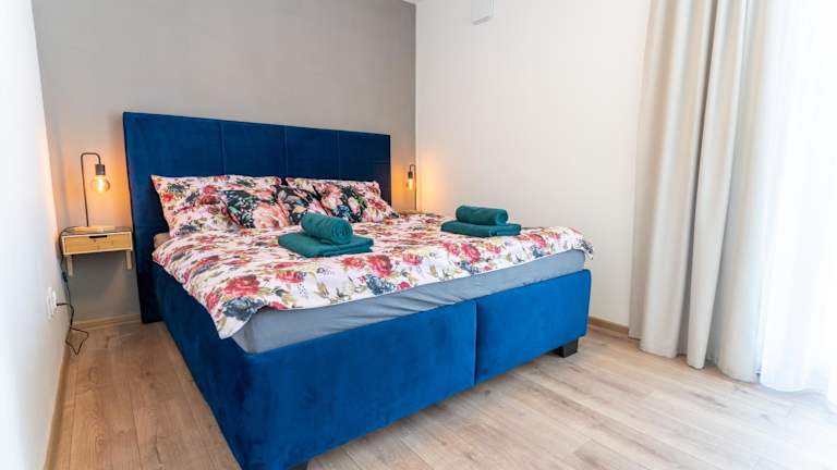 Die Ferienwohnung umfasst ein Schlafzimmer, ein Wohnzimmer mit Flachbild-TV sowie eine voll ausgestattete Küche mit Kühlschrank und Geschirrspüler. Ein Badezimmer mit Haartrockner ist ebenfalls vorhanden. Handtücher und Bettwäsche werden bereitgestellt.