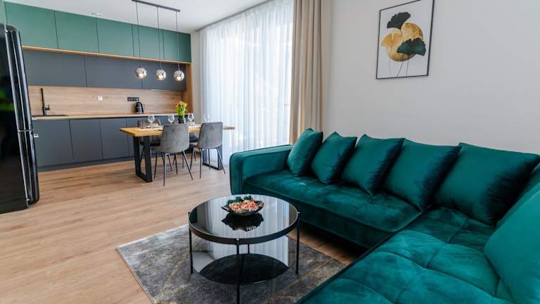 Avocado apartment Victory port bietet eine moderne Ferienwohnung mit einem Schlafzimmer, die durch ihre heimelige Atmosphäre besticht. Die Wohnung verfügt über eine Terrasse und einen Garten, ideal für entspannende Momente im Freien.