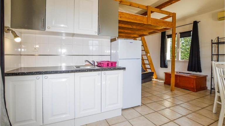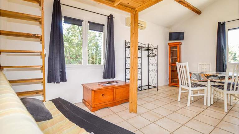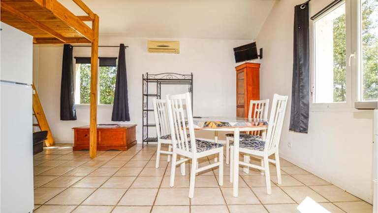 Das Ferienhaus ist klimatisiert und verfügt über ein Schlafzimmer sowie einen gemütlichen Essbereich. Zur Ausstattung gehören ein TV, eine Küche mit Kühlschrank und Geschirrspüler sowie Gartenmöbel, die zum Verweilen einladen.