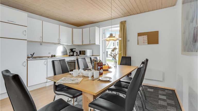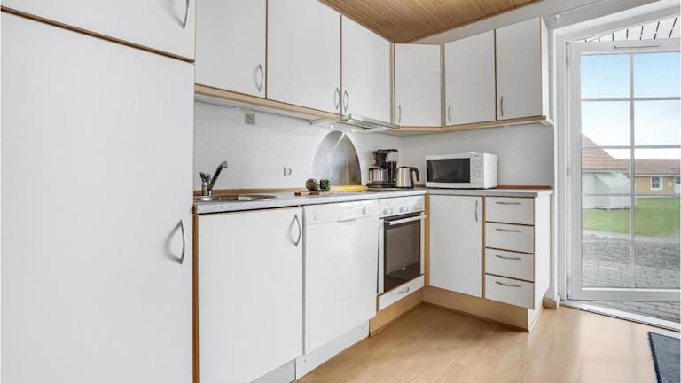 Die voll ausgestattete Küche im Ferienhaus ermöglicht es den Gästen, eigene Mahlzeiten zuzubereiten. Diese umfasst unter anderem einen Kühlschrank, Geschirrspüler, Mikrowelle und Herdplatte. Grillmöglichkeiten sind ebenfalls vorhanden.