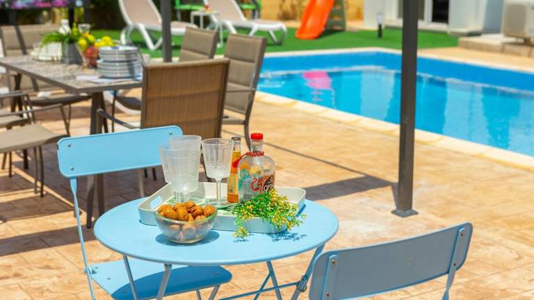 Die Villa bietet vier Schlafzimmer, ein Wohnzimmer und eine voll ausgestattete Küche mit Kühlschrank und Kaffeemaschine. Es befinden sich zwei Badezimmer mit Dusche und Haartrockner in der Unterkunft. Handtücher und Bettwäsche werden bereitgestellt. Die Villa ist klimatisiert und bietet ein heimeliges Ambiente mit Poolblick.