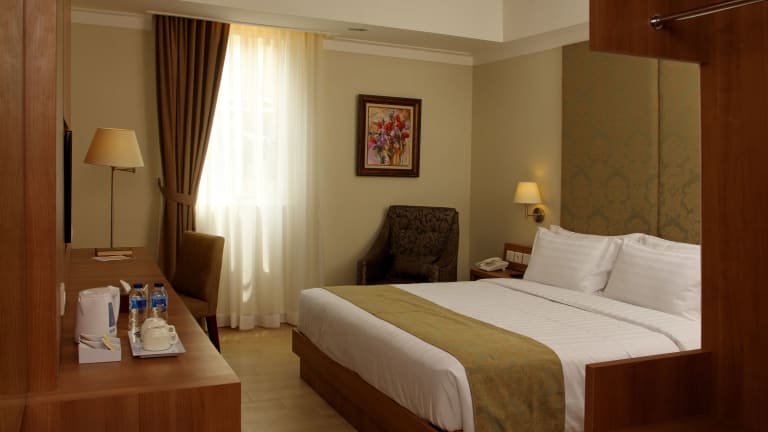 Die Zimmer sind mit Klimaanlage, einem Doppel- oder Kingsize-Bett, Zustellbetten auf Anfrage, einem Safe, einer Minibar, einem Schreibtisch sowie einer Tee-/Kaffeemaschine ausgestattet. Die Bequemlichkeit wird durch ein Telefon, ein TV-Gerät mit Satelliten-/Kabelempfang und gratis Wifi erhöht. Die Badezimmer sind mit einer Dusche, einem Haartrockner und Kosmetikartikeln ausgestattet. Familien- und Nichtraucherzimmer sind ebenfalls verfügbar, sowie barrierefreie Badezimmer.