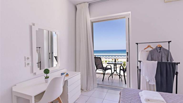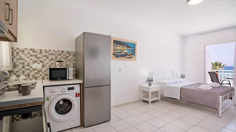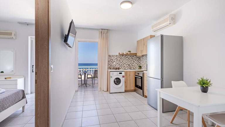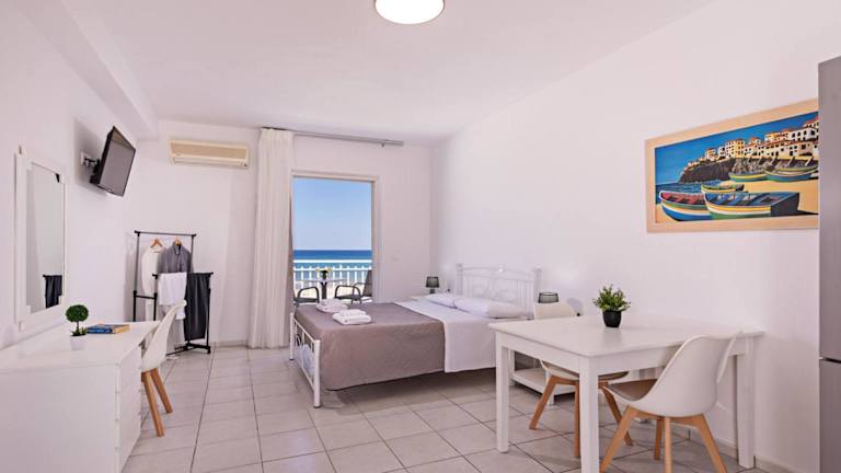 Die klimatisierten Wohneinheiten sind mit Fliesenböden, einem eigenen Badezimmer, Flachbild-TV, einem Schreibtisch und einer komplett ausgestatteten Küche eingerichtet. Jede Wohneinheit verfügt zudem über eine Terrasse mit Meerblick. Zu den Küchenausstattungen gehören Kühlschrank, Ofen, Mikrowelle und Kaffeemaschine.