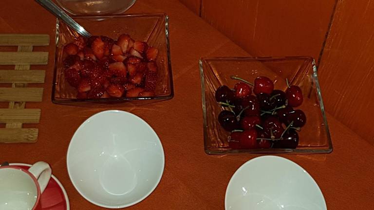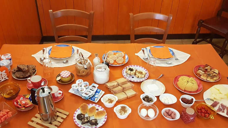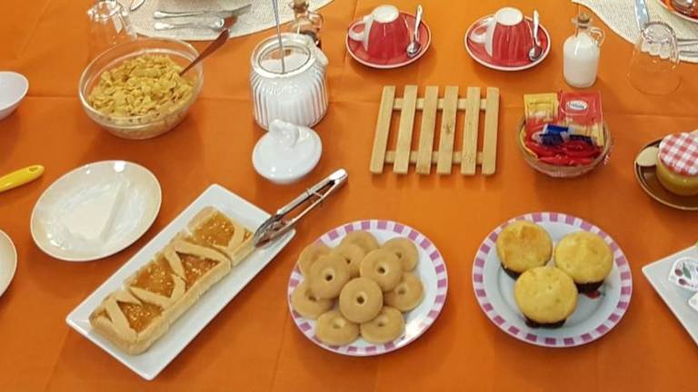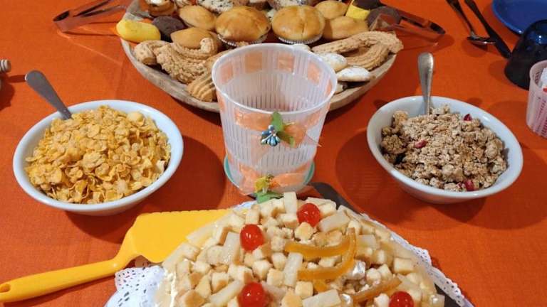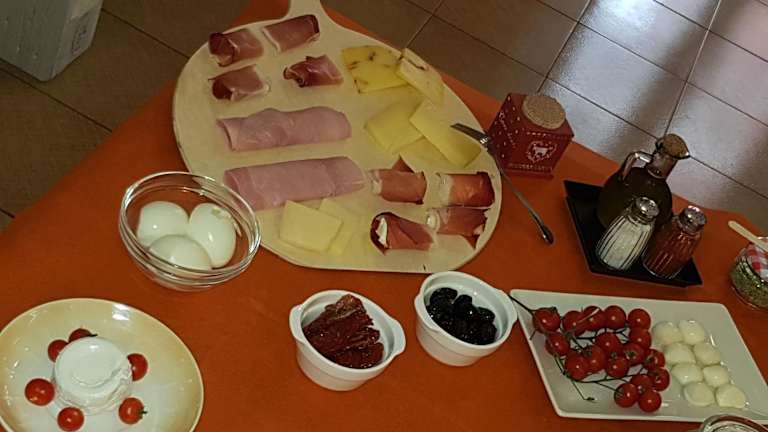 Ein vielseitiges Frühstück wird als Buffet angeboten, mit Optionen für italienische und vegetarische Speisen.