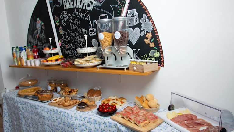 Zum Frühstück bedienen sich die Gäste täglich im gemeinschaftlich genutzten Frühstücksraum am Buffet. Speisen für spezielle Ernährungsbedürfnisse werden auf Anfrage bereitgestellt, und es ist möglich, Essenslieferungen in die Unterkunft zu bestellen.