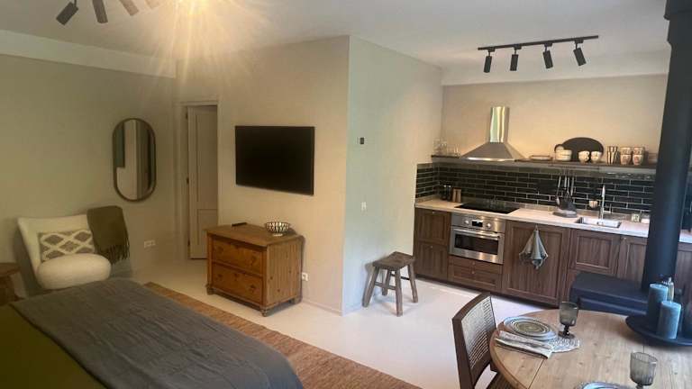 Die Ferienwohnung umfasst ein Schlafzimmer, ein Wohnzimmer, ein Badezimmer mit Dusche, eine gut ausgestattete Küche sowie eine Terrasse mit Gartenblick. Handtücher und Bettwäsche werden bereitgestellt.