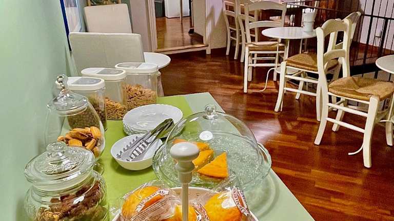 Ein italienisches Frühstück wird täglich im eigenen Zimmer über der Rezeption serviert. Zudem stehen Möglichkeiten zur Verfügung, kleine Snacks in Form von Zvieri zu geniessen. Es gibt eine Snackbar und Gemeinschaftsküche, die den Gästen zur Verfügung stehen.
