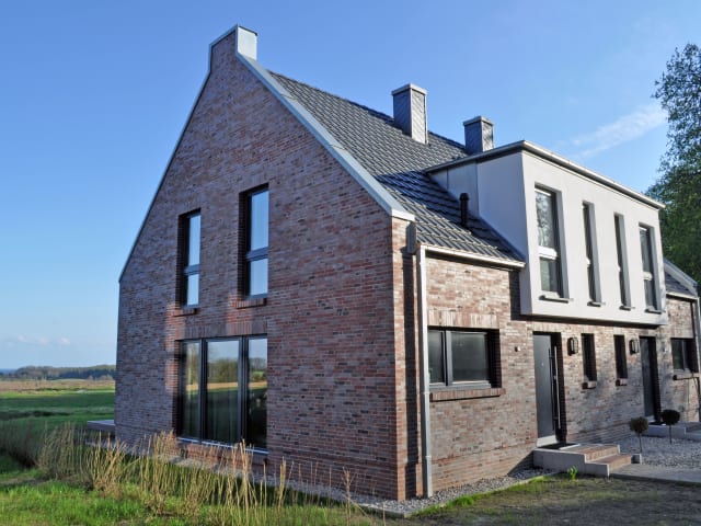 Klare Linien, eine typische Fassade, große Fensterflächen und eine stimmige Inneneinrichtung lassen keine Wünsche offen. In jeder Haushälfte stehen auf zwei Geschossen eine Wohnfläche von ca.100 qm zur Verfügung. Im Erdgeschoss gibt es ein Wohn-/Essbereich mit offener Küche, bestehend aus Küchenzeile und Küchenblock, sowie eine Sauna und ein Kamin. Großzügige Fensterfronten, die auf der Rückseite auf eine große zur Südseite hinausliegende Terrasse führen, bieten einen herrlichen Blick auf das Wasser. Im Erdgeschoss befinden sich ferner jeweils ein Gäste-WC und eine offene Garderobe. Im Obergeschoss, welches man über eine Eichenholztreppe erreicht, liegen jeweils zwei Schlafzimmer, ein Bad mit Badewanne und Dusche sowie eine Galerie mit Wasserblick. Die gesamte Wohnung ist mit einer Fußbodenheizung ausgestattet.