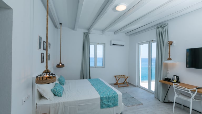 Unsere neu designten Zimmer mit dem besonderen griechischen Flair ist der perfekte Ort für Ihren Urlaub Alle Zimmer ist großzügig und modern ausgestattet mit dem gewissen griechischem Gefühl. Die Farben sind so gewählt und kombiniert, so dass die lokalen Einflüsse sich wiederspiegeln. Boutique, Lebensstil, Romantik – alles, wovon wir bei der Gestaltung der Gästezimmer in unserem Hotel hätten träumen können. Jedes Zimmer bietet Ihnen einen perfekten Aufenthalt, ruhig, verwöhnend und perfekt auf die einzigartige Atmosphäre abgestimmt, die wir bieten. Jedes Zimmer ist geräumig und komplett ausgestattet in einem modernen griechischen Ambiente. Das helle Weiß des Raumes fügt sich perfekt in das Blau des Meeres ein, das aus jedem Winkel glänzt. Unser Hotel verfügt über eine Reihe von unterschiedlichen Gästezimmern, von zwei Personen bis zu Familiengrößen.