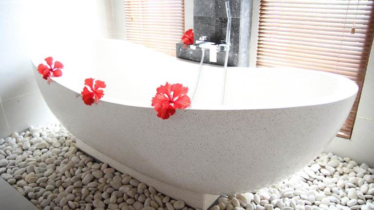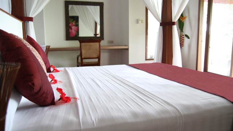 Die klimatisierten Unterkünfte bieten eine Terrasse, einen Kleiderschrank und ein Moskitonetz. Der Essbereich ist mit einem Kühlschrank, einem Wasserkocher und einer Minibar ausgestattet. Die Zimmer verfügen über ein eigenes Bad mit Dusche und Badewanne sowie einen Haartrockner. Zudem geniessen die Gäste einen herrlichen Blick auf das Meer und den Pool.