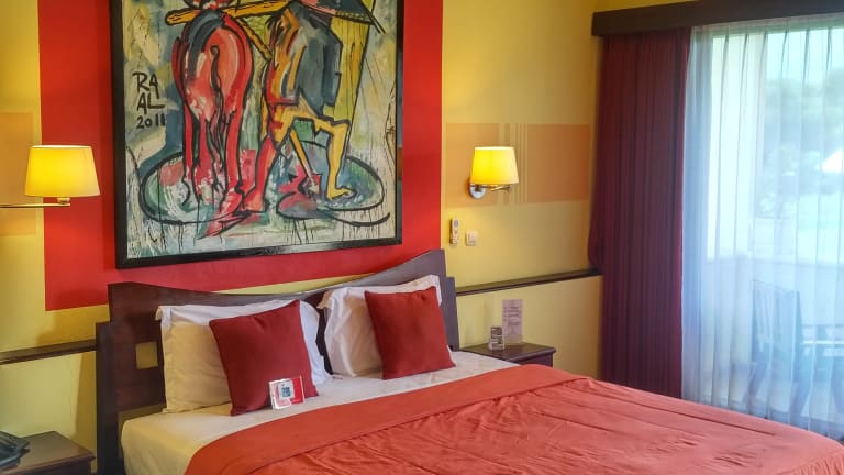 DE LUXE SUPERIOR ROOM - Ocean View (6 x 6 m) (20 x 20 FT) 36 qm (Total with Bathroom and Balcony = 79qm) 1 King Size Bed, A/C and Ceiling Fan, SAT-TV (intern.News, Sport- and Movie-Channel), In-Room Safe, Phone, WIRELESS Internet Access in Room, Roomservice, Minibar, Hairdryer, Bathrobe, Large Bathroom with Bathtub and seperate Shower, large Balcony with 2 Lawn Chairs and Dining Table, Teak Furniture troughout. FREE Wi-FI DE LUXE FAMILY ROOM - Ocean View (6 x 6 m) (20 x 20 FT) 36 qm (Total with Bathroom and Balcony = 79qm) 1 big room with 2 Queen Size Bed, A/C and Ceiling Fan, SAT-TV (intern.News, Sport- and Movie-Channel), In-Room Safe, Phone, WIRELESS Internet Access in Room, Roomservice, Minibar, Hairdryer, Bathrobe, Large Bathroom with Bathtub and seperate Shower, large Balcony with 2 Lawn Chairs and Dining Table, Teak Furniture throughout. FREE Wi-FI DE LUXE CLASSIC ROOM - Mountain View and Ricefield (6 x 5.5 m) (20 x 17 FT) 32 qm 1 King Size Bed, A/C and/or Fan, Roomservice, Phone, WIRELESS Internet Access in Room, Minibar, in-Room Safe, SAT-TV (intern.News, Sport- and Movie-Channel). Large Bathroom with Bathtub and seperate Shower, Teak Furniture throughout. FREE Wi-FI PRESIDENTIAL SUITE - Ocean and Mountain View: (7 x 10.5 m) (20 x 35 FT) 73,50 qm - Total with bathroom and huge Balcony 114 qm 1 King Size Bed, A/C and Ceiling Fan, SAT-TV (Indovision - 99 digital intern.channels like CNN, BBC, Star Movie, CineMax, Eurosport, Star Sport, ESPN, Discovery Channel etc.), DVD and CD Player, In-Room Safe, Roomservice, Phone, WIRELESS Internet Access in Room, Minibar, Hairdryer, Bathrobe, Large Bathroom with Bathtub and seperate Shower, large Balcony with 2 Lawn Chairs and Dining Table, Teak Furniture throughout. FREE Wi-FI