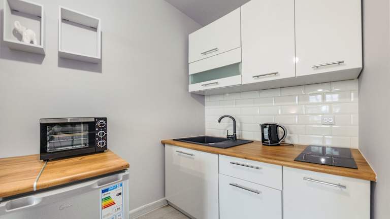 Die Appartements sind in warmen Farben gehalten und verfügen über einen Balkon mit Tisch und Stühlen. Jedes Appartement hat ein Bad mit Dusche, einen Sitzbereich sowie eine gut ausgestattete Küchenzeile mit Kühlschrank, Herd und Backofen.