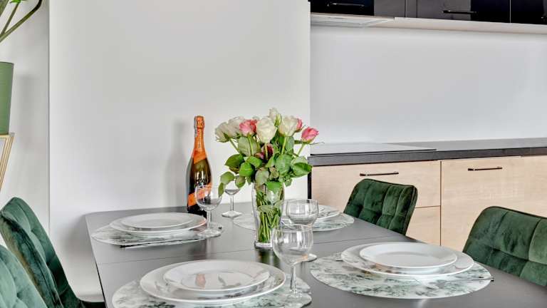 Die Ferienwohnung umfasst 2 Schlafzimmer, ein Wohnzimmer, eine gut ausgestattete Küche mit Kühlschrank und Geschirrspüler sowie ein Badezimmer mit Dusche. Zudem sind Handtücher und Bettwäsche vorhanden. Ein Balkon mit Aussicht auf die Stadt ergänzt die Ausstattung.