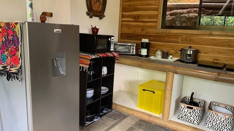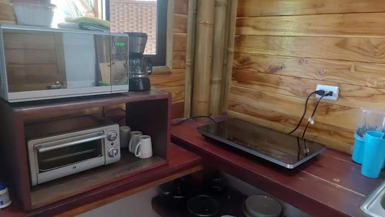 Die Unterkunft verfügt über eine Küche, die mit einem Kühlschrank, einer Mikrowelle, einer Herdplatte und einer Kaffeemaschine ausgestattet ist. Es gibt keine spezifischen Informationen zu Verpflegungsmöglichkeiten, möglicherweise sind Gäste auf Eigenverpflegung angewiesen.