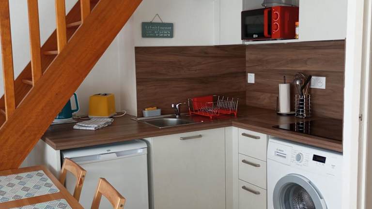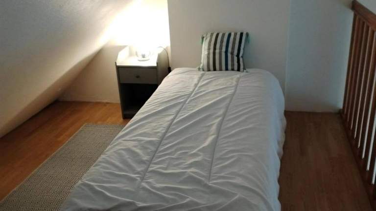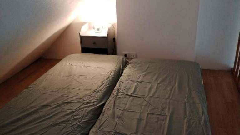 Die Ferienwohnung besteht aus einem Schlafzimmer und einem Wohnzimmer. Sie verfügt über eine voll ausgestattete Küche mit Kühlschrank und Wasserkocher sowie einem Badezimmer mit Dusche und Haartrockner. Insgesamt bietet die Unterkunft eine einfache und heimelige Atmosphäre, perfekt für entspanntes Wohnen während der Ferien.