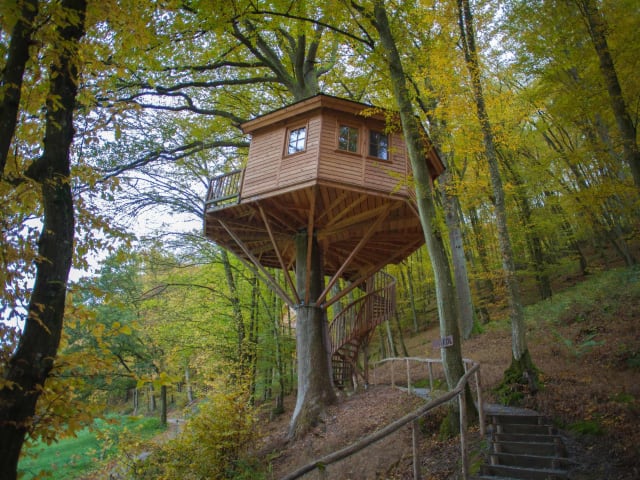 Die Anlage umfasst insgesamt acht Baumhäuser für Gäste. In das Innere Ihrer Unterkunft gelangen Sie über eine große Wendeltreppe. Die Räumlichkeiten zeichnen sich durch einen runden Aufbau aus und bieten jeweils genügend Platz für bis zu vier Personen. Das Badezimmer wird mit fließendem Wasser versorgt und bietet neben dem WC eine Dusche. Die Unterkünfte sind außerdem mit einem großen Balkon ausgestattet, sodass Sie die umliegende Natur schon beim Frühstück bewundern können.