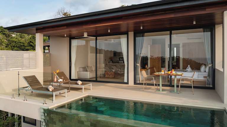 Die komplett eingerichtete Villa Bay Villas Koh Phangan bietet Ihnen Wohnbereiche im Innen- und Aussenbereich, kostenloses Wifi sowie eine Sonnenterrasse mit Meerblick und einem überdachten Sitzbereich am Infinity-Pool. Die Villa hat ein modernes Wohnzimmer mit Sofa, Flachbild-TV und Soundsystem, sowie eine offene Küche mit Frühstückstheke und Kochutensilien.