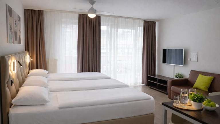 Die hellen und geräumigen Ferienwohnungen in der Unterkunft sind mit einem Bett, einem Smart-TV mit Internetzugang, einem Schlafsofa für 2 Personen, einem modernen Bad sowie einem Wohn- und Essbereich ausgestattet. Schallisolierte Zimmer und Einrichtungen für behinderte Gäste sind zudem vorhanden.