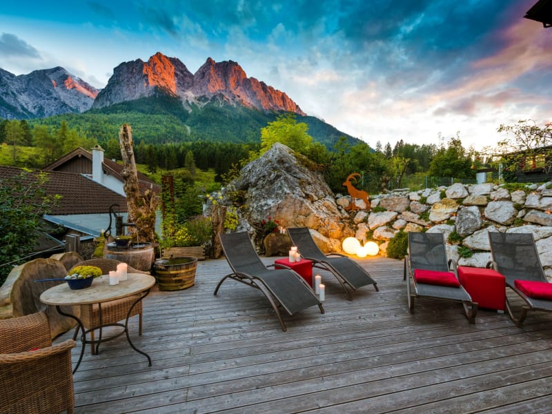 Mitten auf einer Anhöhe gelegen und mit direktem Blick auf die Zugspitze erfahren Ruhesuchende hier herzliche Gastfreundschaft und gehobenen Komfort. Die sprichwörtliche bayerische Gemütlichkeit verbinden wir mit dem Glück der Alpen und einer entspannten Naturverbundenheit. Wählen sie zwischen Hotelzimmer mit Rundumservice oder Ulraub im Apartment für ein wenig mehr Privatsphäre. Neben unserem stilvollen Ambiente in allen Räumlichkeiten bieten wir indoor wie Outdoor Wellness-Highlights und Wohlfühl-Oasen zum Seele baumeln lassen.