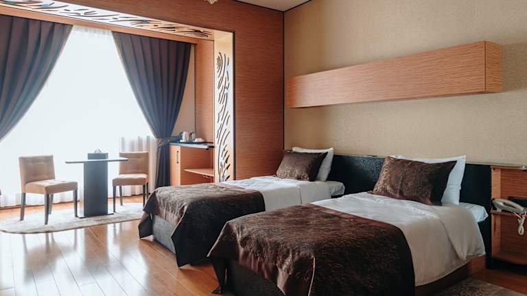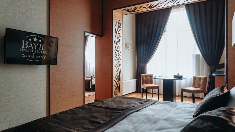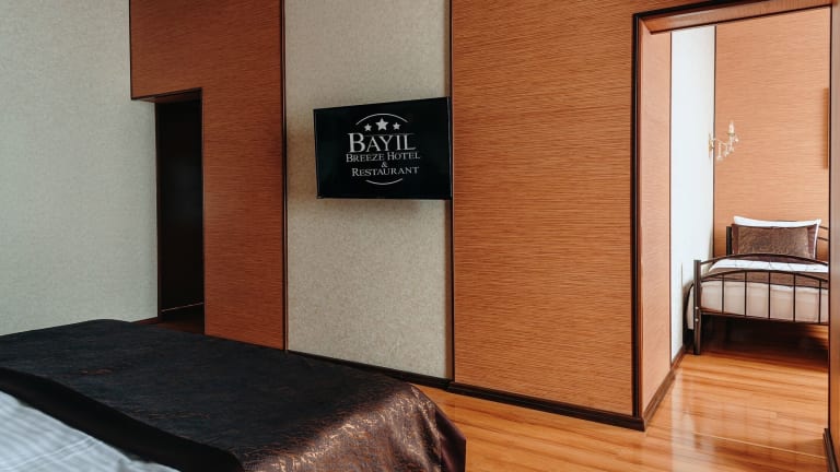 Die Zimmer im Bayil Breeze Hotel sind klimatisiert und verfügen über eine Heizungsanlage. Die mit Teppichböden ausgestatteten Unterkünfte bieten ein Doppelbett oder ein Queensize-Bett, einen Safe, einen Schreibtisch sowie einen Kühlschrank. Zur Ausstattung gehören ebenfalls eine Tee-/Kaffeemaschine, ein TV-Gerät mit Satelliten-/Kabelempfang und kostenloses Wifi. Die Badezimmer sind mit Dusche und Badewanne ausgestattet und bieten Bademäntel sowie Kosmetikartikel. Es sind Familien- und Nichtraucherzimmer verfügbar.