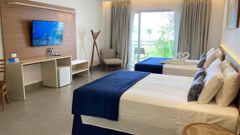 Die klimatisierten Zimmer sind luxuriös eingerichtet und verfügen über einen Balkon mit seitlichem Meerblick, einen LCD-Kabel-TV und eine Minibar. Jedes Zimmer besitzt ein eigenes Bad mit Dusche. WLAN ist gegen Aufpreis verfügbar.