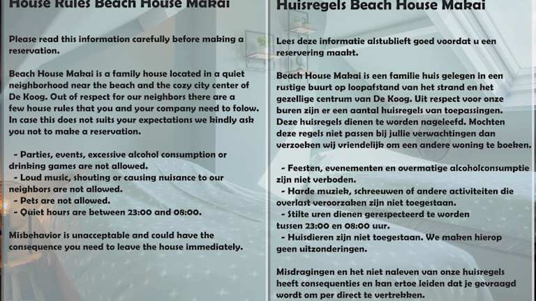 Die Unterkunft Beach House Makai befindet sich 1 km vom Strand De Koog entfernt und in der Nähe von Strand De Cocksdorp, der 1,9 km entfernt liegt. Ecomare ist 2,6 km von der Unterkunft entfernt. Der nächstgelegene Flughafen ist der Flughafen Schiphol, 93 km entfernt.