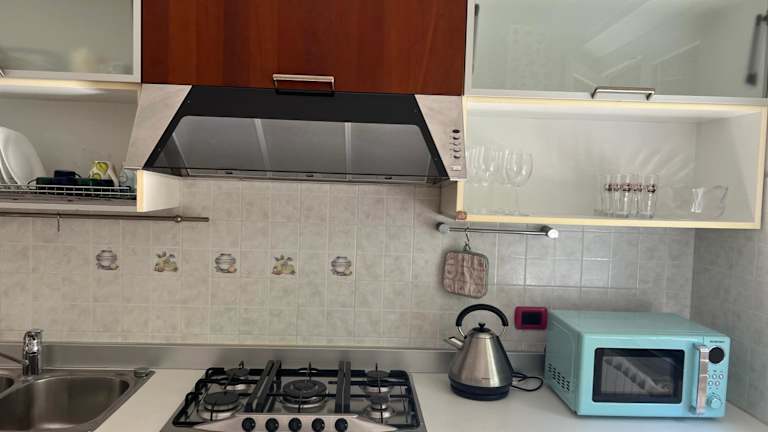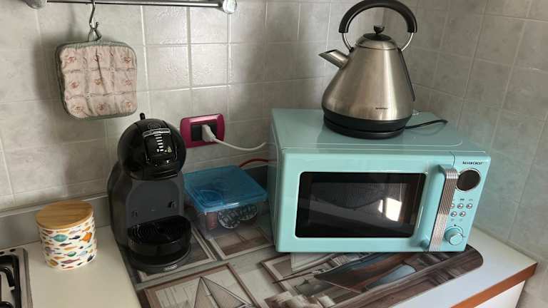 Die Küche der Ferienwohnung ist gut ausgestattet mit einem Kühlschrank, einem Ofen, einer Mikrowelle sowie einer Kaffeemaschine und einem Wasserkocher, was die Zubereitung von Speisen und Getränken erleichtert.