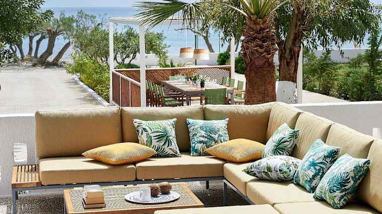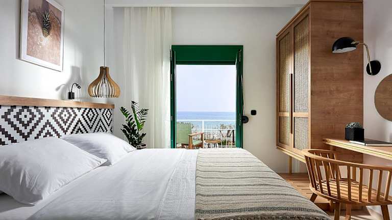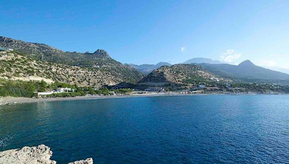 Die Beachfront Villa on Crete - Kirvas befindet sich in Koutsounari, nur 3 Meter vom Strand entfernt. Die Umgebung ist von Olivenbäumen und Palmen geprägt und bietet eine ruhige Ferienatmosphäre.
