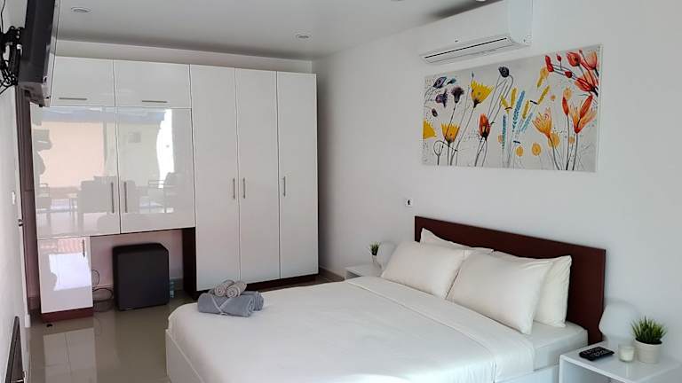 Die Ferienwohnung besteht aus 3 Schlafzimmern, einem Wohnzimmer und einer voll ausgestatteten Küche mit Kühlschrank und Wasserkocher. Es gibt 2 Badezimmer, die jeweils mit einer Dusche und einem Haartrockner ausgestattet sind. Handtücher und Bettwäsche werden bereitgestellt. Die Unterkunft ist klimatisiert und bietet Platz für Familien oder Gruppen.