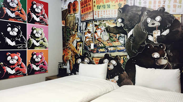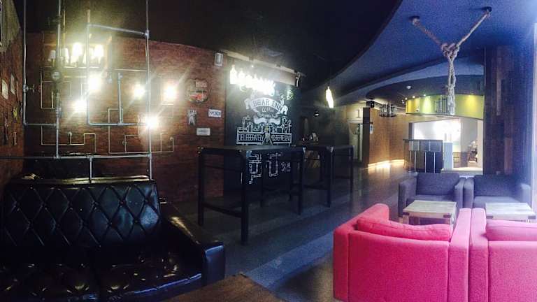 Das Bear Hotel bietet eine Kombination aus Hotelservice und der Gemütlichkeit einer Ferienunterkunft. Die Architektur zeichnet sich durch lebendige natürliche Farben wie Grün, Orange und Pfirsichrot aus, mit roten Ziegelwänden und heimeligen Holz-Elementen. Die moderne und industrielle Stilrichtung sorgt für einladende Atmosphäre, die an eine Rückkehr in die Wälder erinnert.