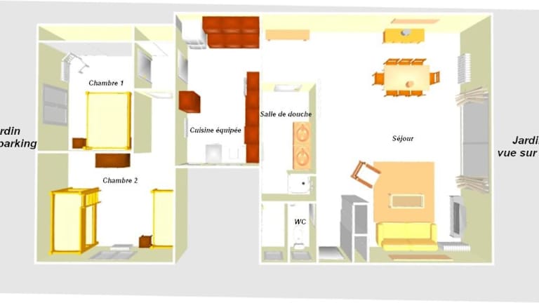 Die Ferienwohnung umfasst 2 separate Schlafzimmer, ein Wohnzimmer mit TV, eine voll ausgestattete Küche mit Kühlschrank und Geschirrspüler sowie ein Badezimmer mit Dusche.