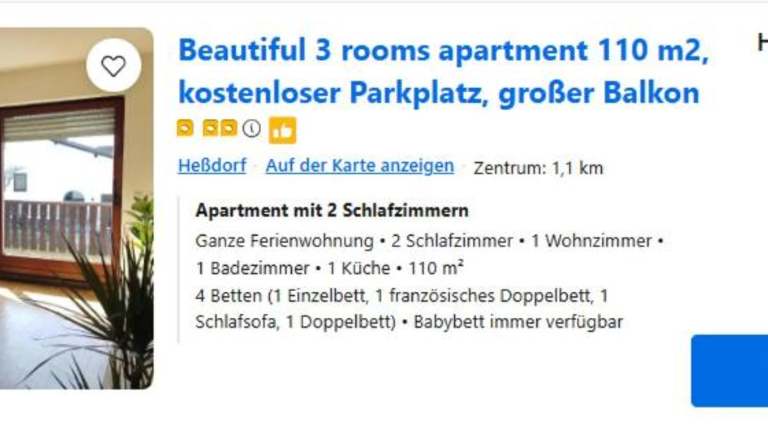 Die Unterkunft Beautiful 3 rooms apartment 110 m2, kostenloser Parkplatz, grosser Balkon liegt in der Umgebung von Nürnberg, ca. 33 km vom Hauptbahnhof Nürnberg sowie 34 km von der Meistersingerhalle entfernt. Der nächstgelegene Flughafen ist der Flughafen Nürnberg, welcher 22 km entfernt ist.