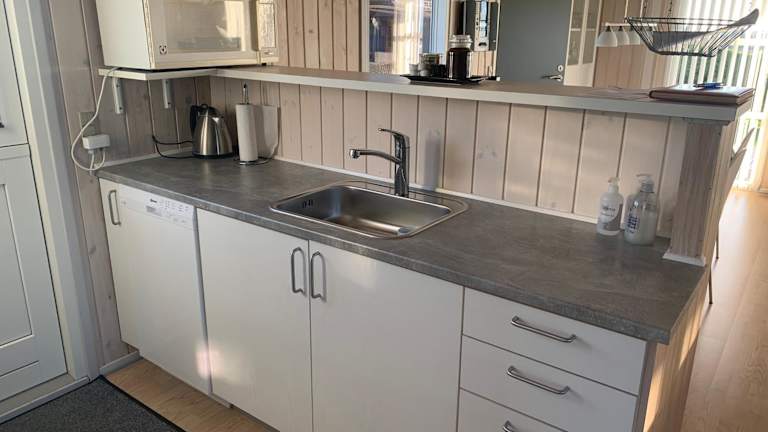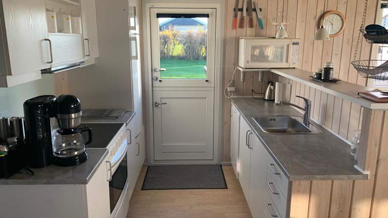 Eine gut ausgestattete Küche mit Kühlschrank, Geschirrspüler und Ofen ermöglicht es den Gästen, eigene Mahlzeiten zuzubereiten. Grillmöglichkeiten sind ebenfalls vorhanden.