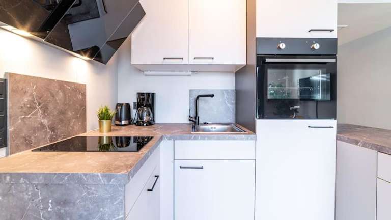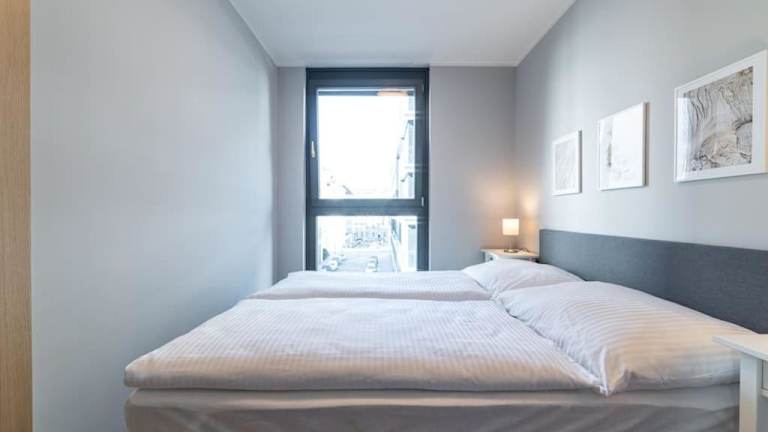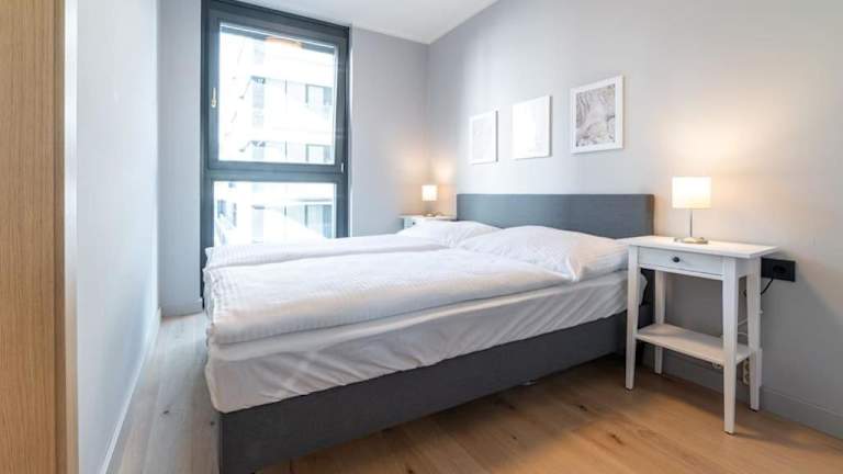 Die Ferienwohnung verfügt über ein Schlafzimmer, eine Küche mit Kühlschrank und Geschirrspüler, einen Flachbild-TV, einen Sitzbereich sowie ein Badezimmer mit Dusche. Handtücher und Bettwäsche werden bereitgestellt.