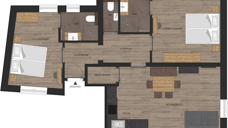 Die Ferienwohnung ist ausgestattet mit einem Wohnzimmer, einer voll ausgestatteten Küche, 2 Schlafzimmern und 2 Badezimmern. Handtücher und Bettwäsche sind vorhanden.