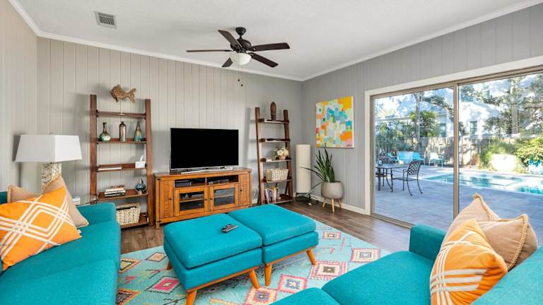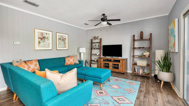 Das Ferienhaus bietet 4 Schlafzimmer und ein gemütliches Wohnzimmer mit Kabel-TV. Die voll ausgestattete Küche beinhaltet einen Kühlschrank und Geschirrspüler. Die Badezimmer sind mit einer Badewanne oder Dusche ausgestattet.