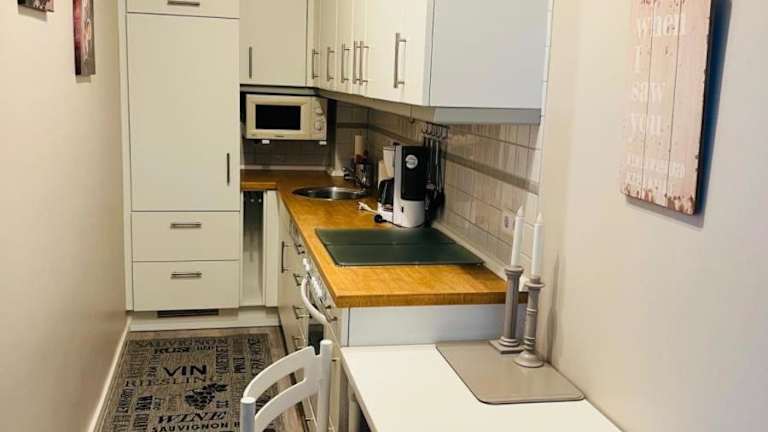 Die Ferienwohnung ist mit einer Küche ausgestattet, die über einen Kühlschrank, Geschirrspüler, Ofen, Kaffeemaschine und Wasserkocher verfügt. Es sind keine weiteren Informationen zu Verpflegungsmöglichkeiten vorhanden.