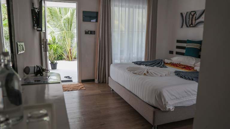 Die Zimmer in der Unterkunft Belvedere Thoddoo verfügen über Klimaanlage, einen Sitzbereich und einen Flachbild-TV mit Kabelkanälen. Ein eigener Safe und ein Badezimmer mit Dusche, kostenlosen Pflegeprodukten und einem Haartrockner sind ebenfalls vorhanden. Bettwäsche und Handtücher werden bereitgestellt.