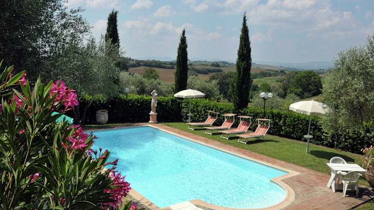 Entspannen Sie am privaten Außenpool der Villa und genießen Sie die Ruhe und Schönheit der umliegenden Sonnenblumenfelder und Weinberge. Nutzen Sie den Garten und die Terrasse für gemütliche Abende im Freien. Erkunden Sie die Umgebung und besuchen Sie die nahegelegenen Terme di Montepulciano und Bagno Vignoni für weitere Freizeitmöglichkeiten.
