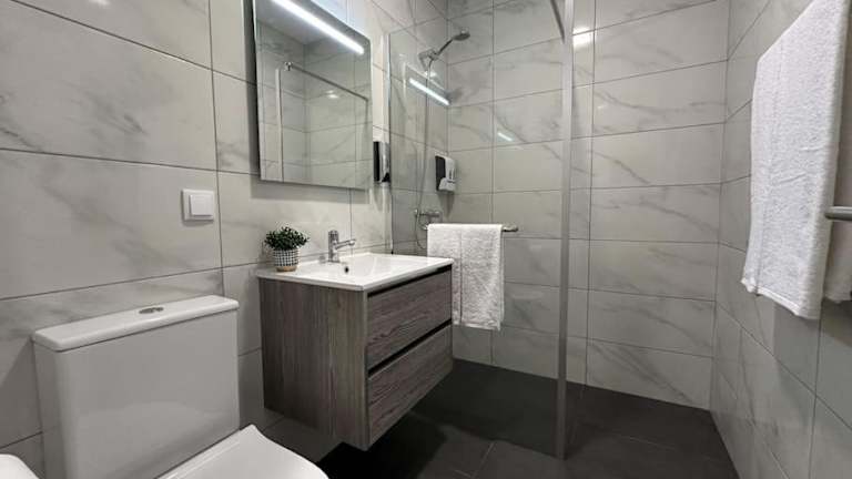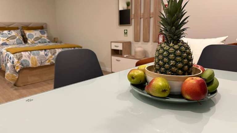 Die Ferienwohnung besteht aus einem Schlafzimmer, einem Wohnzimmer und einer voll ausgestatteten Küche, die mit einem Kühlschrank und einem Wasserkocher ausgestattet ist. Zusätzlich sind ein Badezimmer mit Dusche und Haartrockner vorhanden. Handtücher und Bettwäsche werden bereitgestellt.