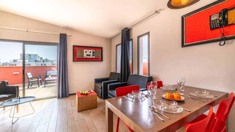 Die Apartments sind klimatisiert und verfügen über ein angenehmes Raumklima. Sie sind mit Designermöbeln, einem Kühlschrank, einer Mikrowelle und einer Tee-/Kaffeemaschine ausgestattet. Zudem gehören ein Schreibtisch, ein Telefon, Sat-TV sowie kostenloses Internet zur Einrichtung. Die Badezimmer sind ausgestattet mit einer Dusche oder Badewanne und einem Haartrockner. Familien- und Nichtraucherzimmer stehen ebenfalls zur Verfügung.