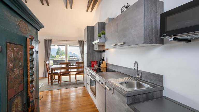 Die Ferienwohnung verfügt über einen Balkon mit Bergblick, ein Schlafzimmer, ein Wohnzimmer, einen Flachbild-TV und eine gut ausgestattete Küche mit einem Kühlschrank und einem Geschirrspüler. Zudem gibt es ein Badezimmer mit einer Dusche. Handtücher und Bettwäsche werden bereitgestellt.
