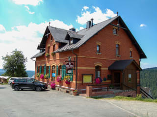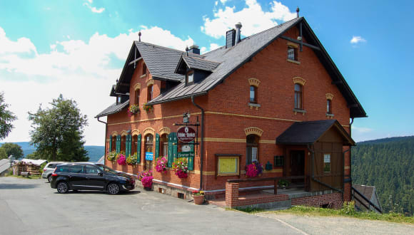 Rustikale, gemütliche Ausflugsgaststätte mit vogtländischer Spezialitätenküche, kleiner Pension und einer Panoramaterrasse mit einem herrlichen Blick auf das "klingende Tal" mit der Vogtland Arena und der neuen Großschanze.