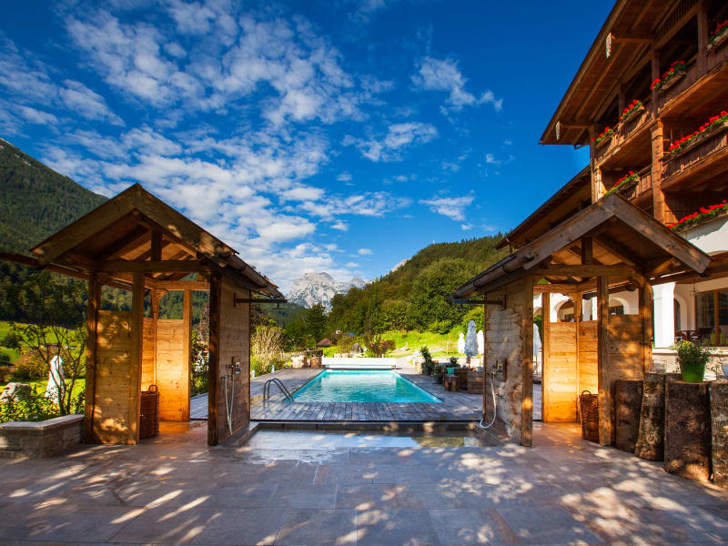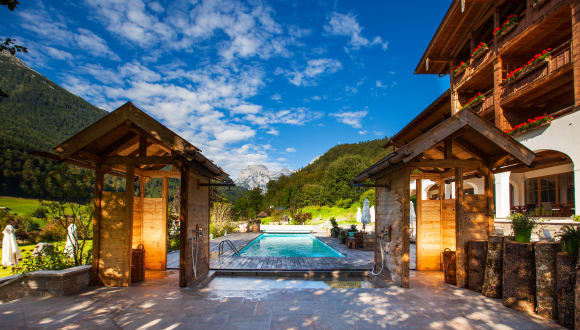 Das Hotel schmiegt sich mitten in den Berchtesgadener Alpen auf eine kleine Anhöhe über dem Ortskern. Hinterm Haus ziehen Wiesenhänge empor, im Süden reiht sich der Watzmanngipfel und seine Nachbarn aneinander. Zahlreiche Wanderwege und Bergtouren beginnen direkt vor dem Hotel.