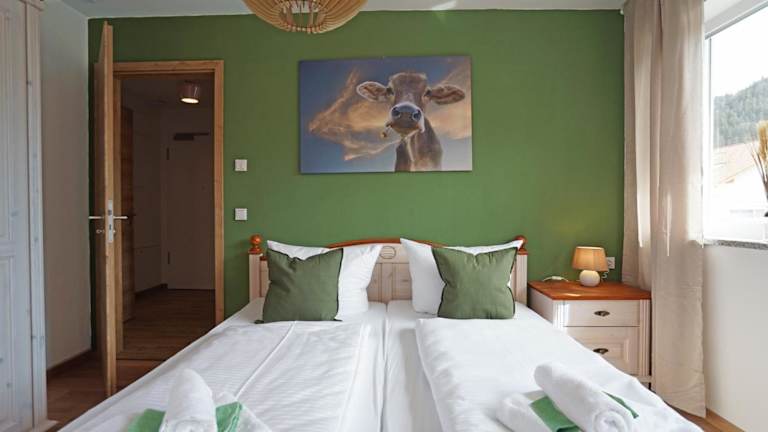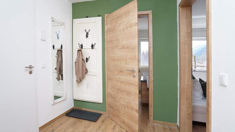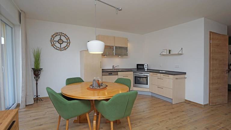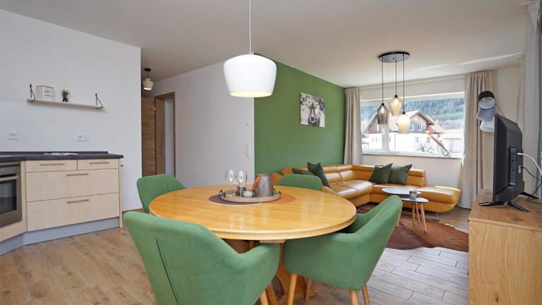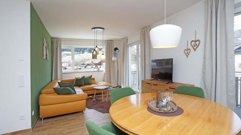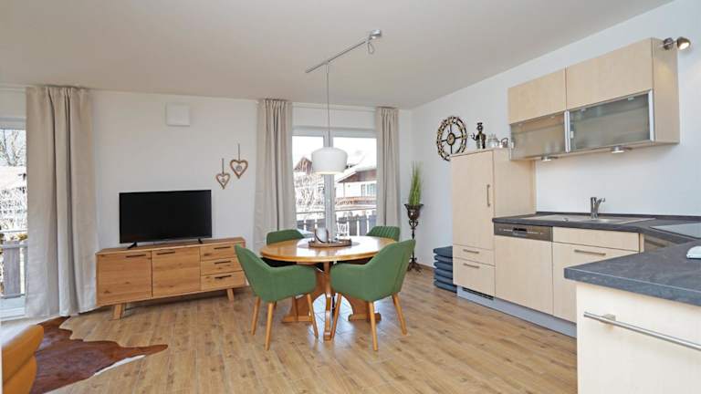 Die Ferienwohnung umfasst ein Schlafzimmer, ein Wohnzimmer mit Flachbild-TV und eine gut ausgestattete Küche, die mit einem Kühlschrank und Geschirrspüler ausgestattet ist. Des Weiteren stehen ein Badezimmer mit Dusche sowie eine Terrasse mit Bergblick zur Verfügung. Handtücher und Bettwäsche können gegen Aufpreis bereitgestellt werden.