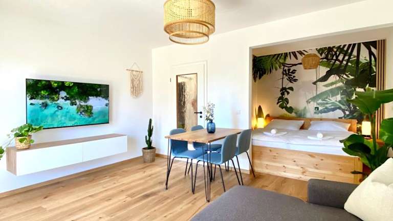 Die Ferienwohnung Best Butler Jungle Suite - Central - Netflix - Big Box bietet eine heimelige Atmosphäre mit einer Sonnenterrasse sowie einem Tourenschalter. Sie ist ideal für Gäste, die sowohl Entspannung als auch die Erkundung der Umgebung suchen.